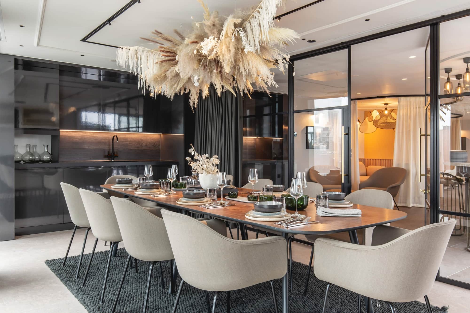 Tucked away on the top floor of this high-profile residential development, sitting alongside a vast rooftop garden, is a haven of comfort and relaxation. Not only does this space play host to private dinner parties in the evening and home workers by day, but its atmosphere gently encourages story telling, and the sharing of experiences between two close friends or two unfamiliar residents.